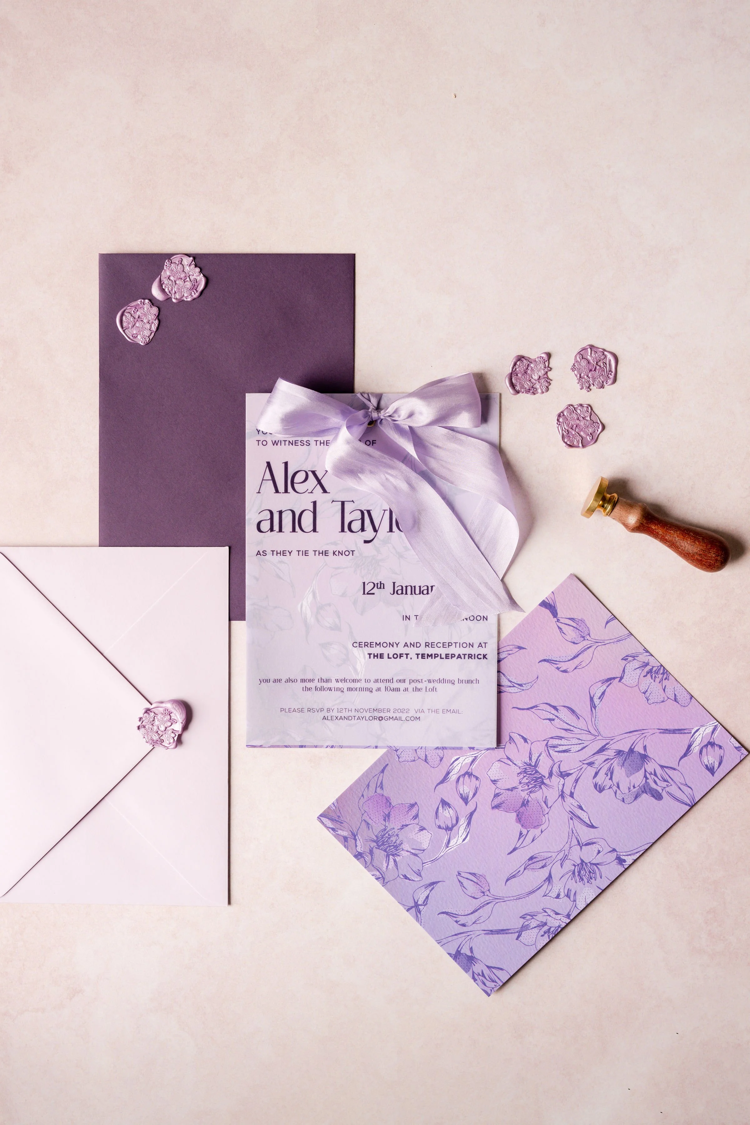 To bloom or not to bloom? Sometimes what you know is the best way to go, florals can seem like the perfect pairing with the romance of a wedding. Add a touch of Efflorescence without overpowering your guests’ first impression. A beautiful hand-illustrated floral pattern in ombre tones of your choice, with a transparent vellum overlay, finished with a metal eyelet and luxury satin ribbon. Push it to the next level with wax seals and envelope liners, this suite definitely oozes style in every way.